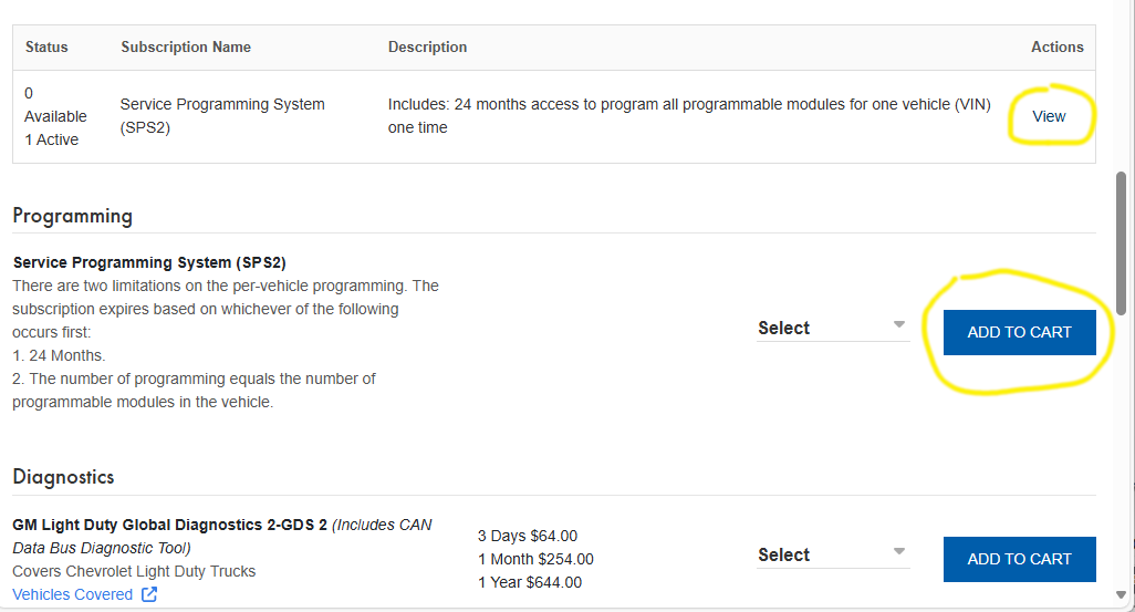circled both the "View" for the currently purchased subscription(s) and the "ADD TO CART" where you buy a new subscription).