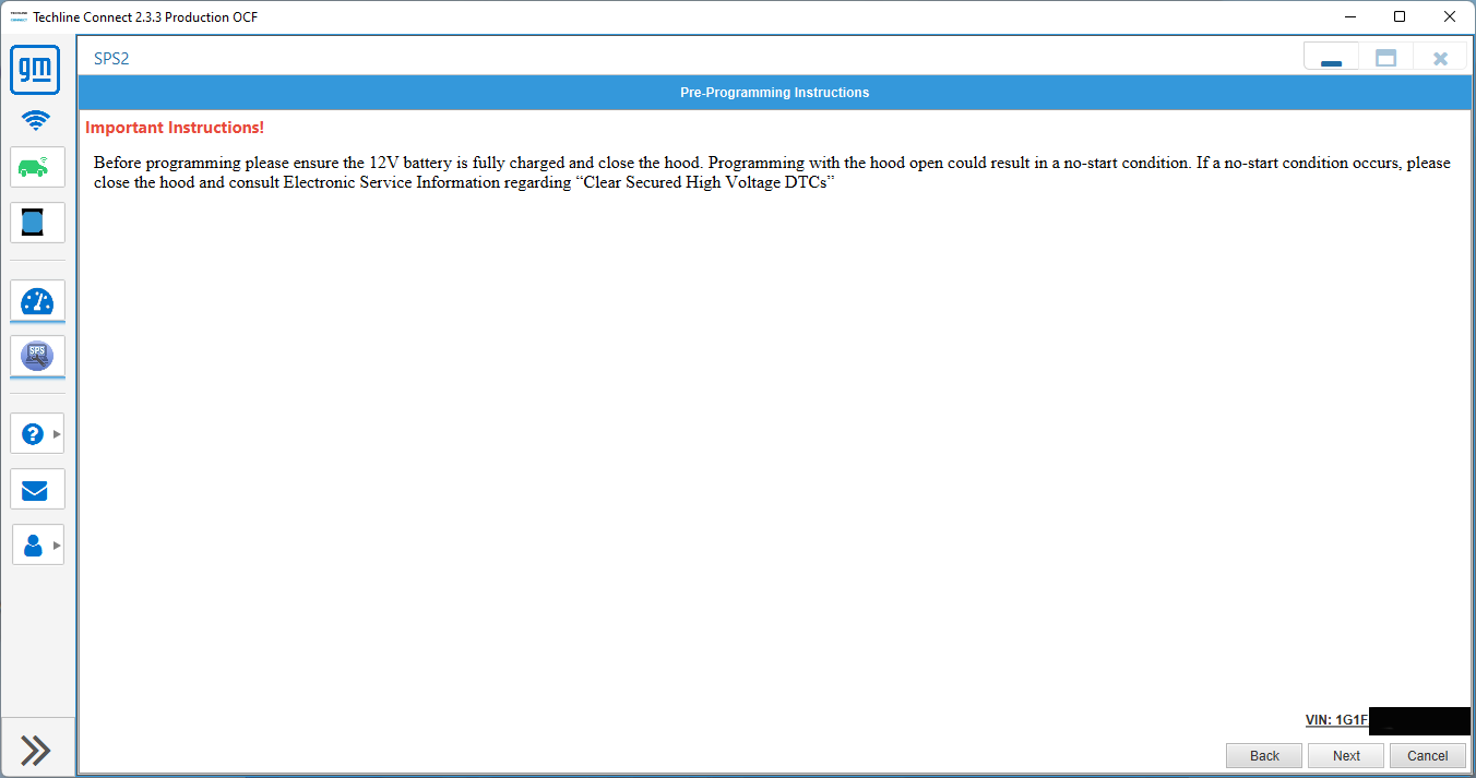 This next screen has important information; basically make sure your 12v battery is healthy and the hood should be completely closed. This is also