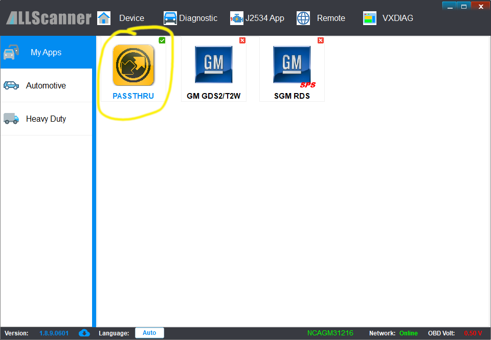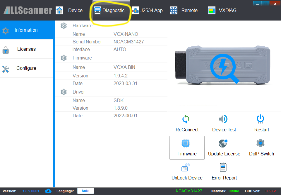If it shows "Diagnostic Tool Ready!" but underneath you don't see VXDIAG in the string (in the screenshot it shows "J2534 ALLScanner;VXDIAG;04 04;",
