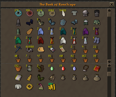 The bank is small, but sweet. It has Fire Cape, Full Void, Torso, Barrows Gloves, 5 Rune Defenders, and approx 11 Mil starting cash! All the difficult items have been accumulated