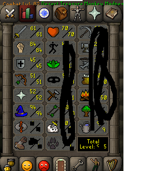 54 range 1 att 1 str 3 def 43 hp and like 48 mage, i dont remeber mage but ill sell for....500k