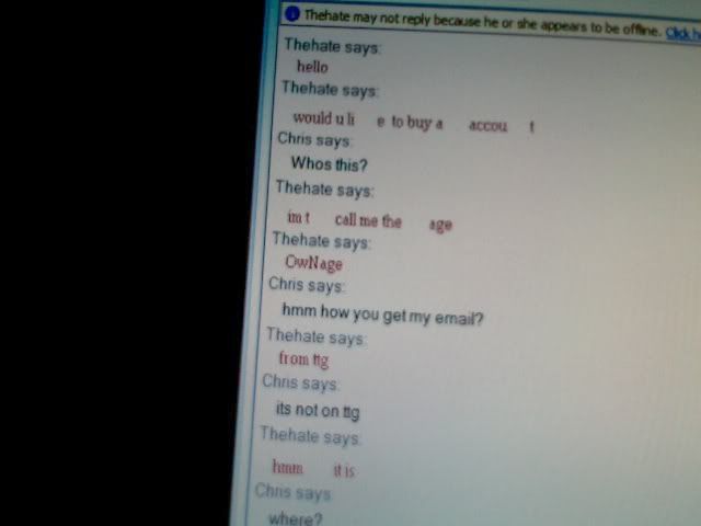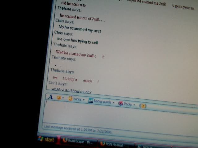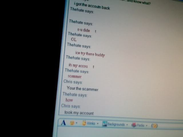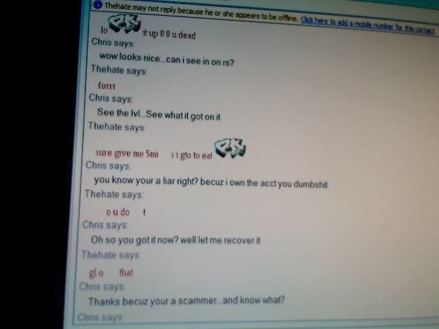 Alright so im chillin on runescape and on msn...Suddenly i get a message that pops up and it says [email protected] asking me if i want to buy an account...So im like ok cool what lvl is it he said 87 im like whats the name...0_0_u_dead...Im like wtf i own that account...Needless to say he got it somehow after Leetsauce sold it to me...[censored]ing Bull[censored]...heres pics of the convo of him admitting he took the account back and canceled my recoveries......And my email verifying i payed for membership on rs for 0_0_u_dead...When i owned it http://images.thetechguide.com/forum/public/style_emoticons/<#EMO_DIR#>/sad.gif\' class=\'bbc_emoticon\' alt=\':(\' />