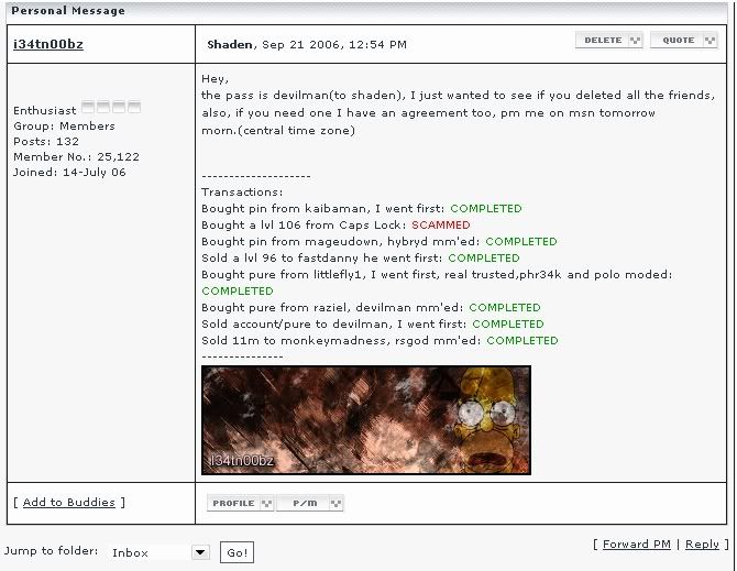 This first time i didnt have anything on the account. After that i put on full karials and alot of runes to go pking with. It was all good for about 3days. I then try to log on today and it says pass invaled, so i approched him about it. this is a convo screenie.