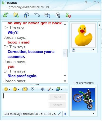 Also I started taking the piss about how he couldn't spell, and was saying stuff like "were bot", which should of been "Where abouts?", I got this reply "[color=\"#ff0000\"]mate u shud no msn is for teens not fukin peedos like u, and we use slang ye not fukni geek words like urself o yeee im so posh ! , [censored]ING PRICK![/color][/size]