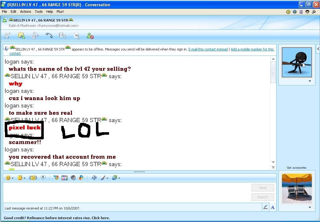 i get on msn today and hes selling an account lvl 47 with 66 range 59 str (similar stats to my account) I ask the name and he says PIXEL LUCK! well that was the name of my account!!!