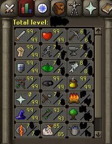 The Character has Nine 99 stats:  99 prayer, ranged, magic, thieving, cooking, Hit Points, Strength, Defense, Attack.