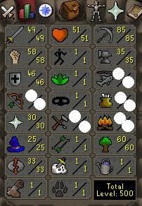 acc 1 : cb : 62    mining : 85 (can mine runtie ore) woodcutting : 60